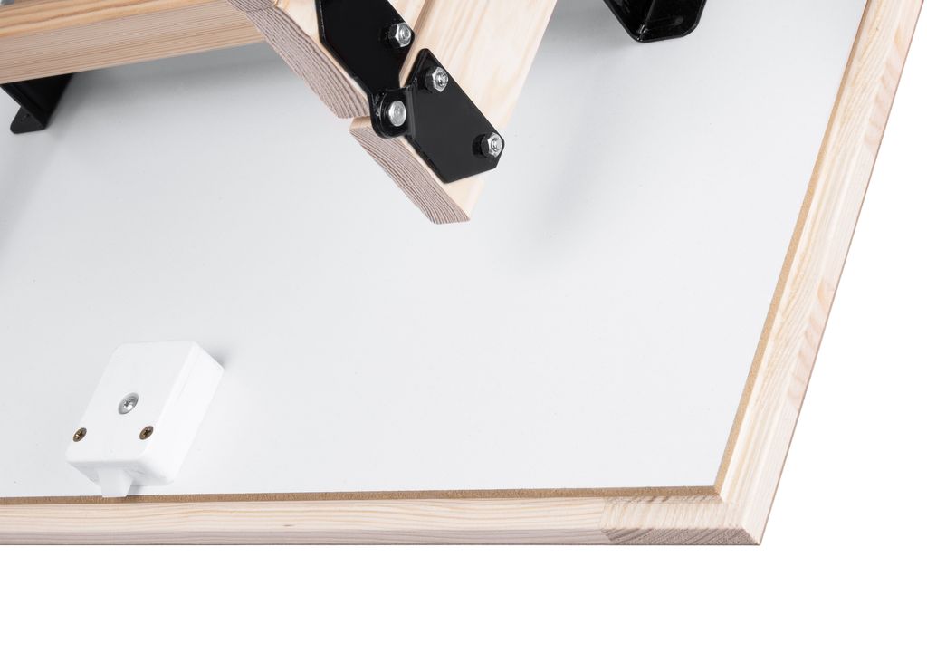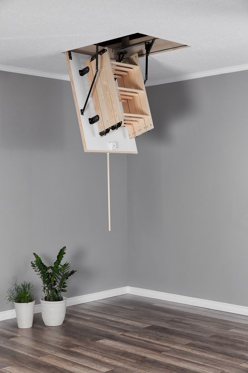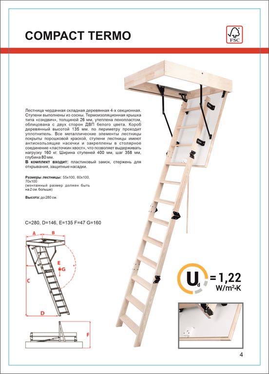 Лестница чердачная складная деревянная 4-х секционная. Ступени выполнены из сосны. Термоизоляционная крышка типа“сэндвич “, толщиной 26мм, утеплена пенопластом , облицована с двух сторон ДВП белого цвета. Лестница предназначена для условий, когда чердак утеплен и не требует дополнительной теплоизоляции. Короб деревянный высотой 135мм, по периметру проходит уплотнитель.