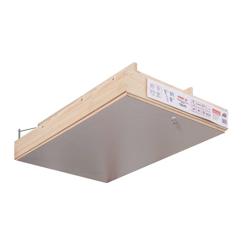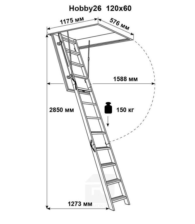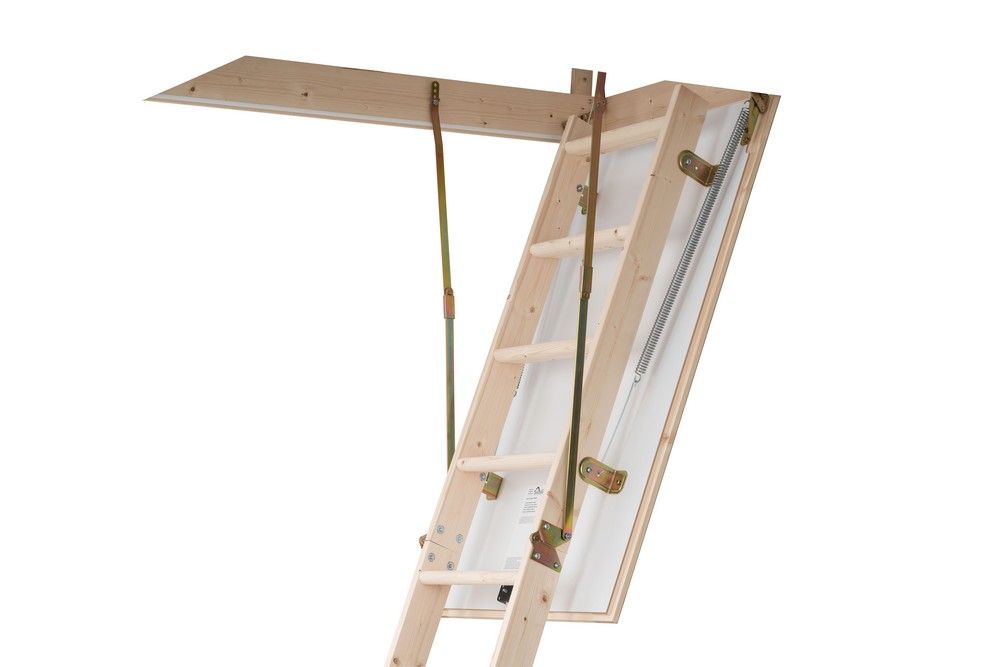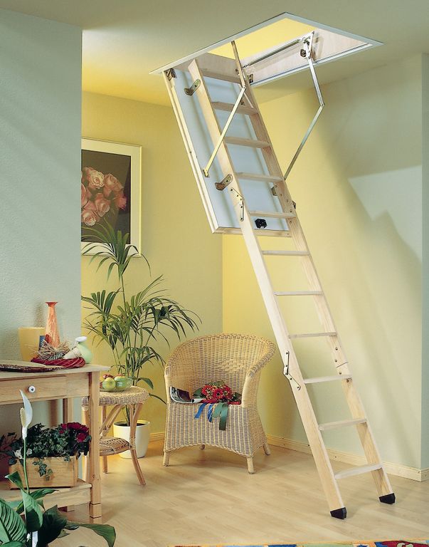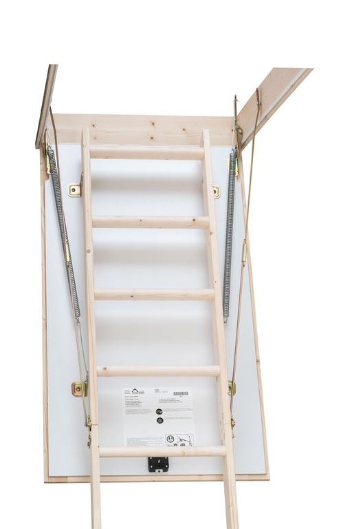 люк из сэндвич-панели, пружинный механизм "короб-люк", короб, трехсекционная лестница с буковыми ступенями, замок люка, штанга для раскладывания лестницы |